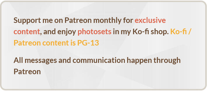 Support me on Patreon monthly for exclusive content, and enjoy photosets in my Ko-fi shop. Ko-fi / Patreon content is PG-13All messages and communication happen through Patreon