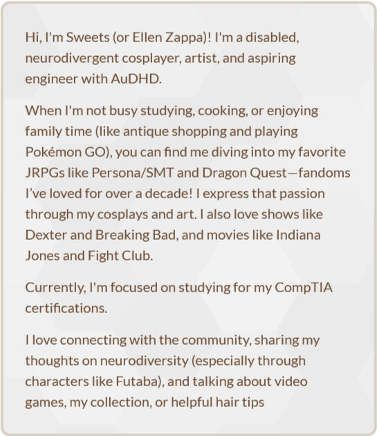Hi, I'm Sweets (or Ellen Zappa)! I'm a disabled, neurodivergent cosplayer, artist, and aspiring engineer with AuDHD.When I'm not busy studying, cooking, or enjoying family time (like antique shopping and playing Pokémon GO), you can find me diving into my favorite JRPGs like Persona/SMT and Dragon Quest—fandoms I’ve loved for over a decade! I express that passion through my cosplays and art. I also love shows like Dexter and Breaking Bad, and movies like Indiana Jones and Fight Club.Currently, I'm focused on studying for my CompTIA certifications.I love connecting with the community, sharing my thoughts on neurodiversity (especially through characters like Futaba), and talking about video games, my collection, or helpful hair tips